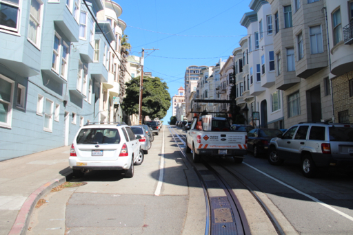 On s'est bien régalé, nous voilà repus pour affronter les rues pentues de Russian Hill. Nous commençons la visite du quartier par le musée du Cable Car. Les fameux trams tirés par un câble souterrain. Ces Cable Cars ont vu le jour dans les années 1870, au plus fort de leur exploitation il y avait 21 lignes avec plus de 600 câbles pour les tirer. Le fonctionnement est simple, un câble tourne en permanence sous la route, les voitures n'ont plus qu'à attraper le câble qui avance à une vitesse constante de 15km/h. Pour s'arrêter il suffit de lâcher le Cable! En fait le fonctionnement est sensiblement le même que les "tire fesses" des stations de ski!
